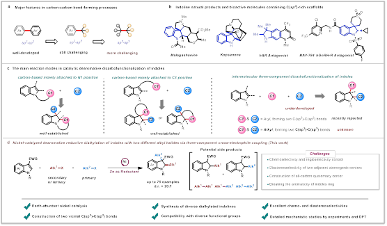 多烷基取代的吲哚啉是众多天然产物和药物分子的核心结构单元,吲哚的催化去芳构双碳官能化是获得多取代吲哚啉最有效的方法之一。原则上,吲哚与两种不同碳官能团化试剂的三组分去芳构化反应是一种具有良好步骤经济性的合成策略,可实现一系列多取代吲哚啉化合物的高效快速合成。然而,由于需要同时控制反应的化学选择性和非对映选择性,以及打破吲哚环的芳香性,这种转化极具挑战性。尤其,烷基亲电试剂难以与金属催化剂发生氧化加成、烷基金属中间体易发生β-H消除等使得吲哚与两个烷基试剂的去芳构化反应一直未能实现。
